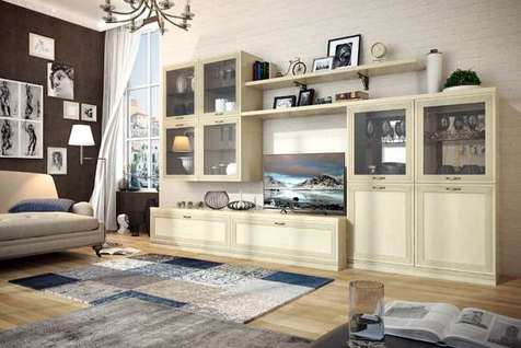 Для создания еще более гармоничного интерьера в гостиную можно дополнительно подобрать кремовый или темный диван классических форм, изящный журнальный столик со стеклянной поверхностью. Если же вы хотите совместить гостиную с рабочей зоной — не забудьте про стол на высоких ножках и мягкое кресло с текстурной обивкой.