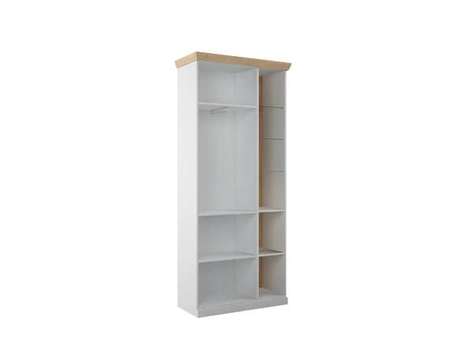 Верхнее отделение за откидной дверью с подъемным механизмом, среднее — открытое отделение с 3 съемными щитовыми полками, нижнее отделение — с 2 выдвижными ящиками;