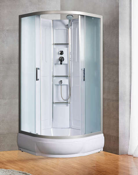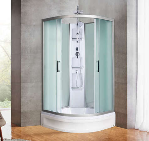 размер: 100х100 cм, четверть круга, поддон: низкий, узорчатые, с крышей, мозаика, белый, задние стенки: стекло , белый поддон, белый профиля, высота: 228 см, двери: раздвижные, 4, алюминий, 17 см, 7 см, закрытая, стекло, на поддон, универсальная, верхний душ, полочка