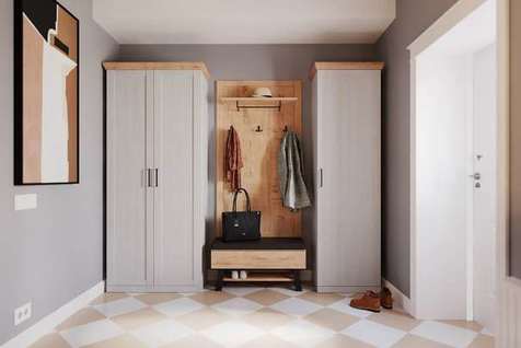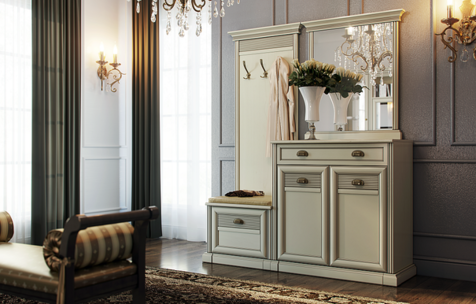 В комплект №3 компактной прихожей «Белладжио» входят: тумба для обуви, вешалка для одежды и шкаф с зеркалом.