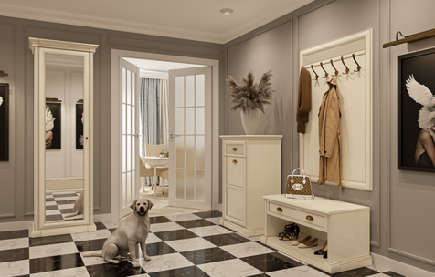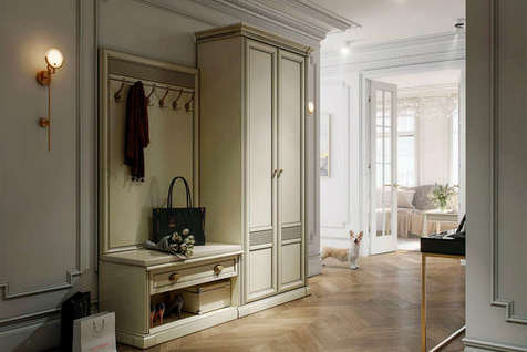 В комплект №6 прихожей «Белладжио» входят: шкаф для одежды, стеллаж, две тумбы для обуви и вещей, вешалка для одежды и зеркало.