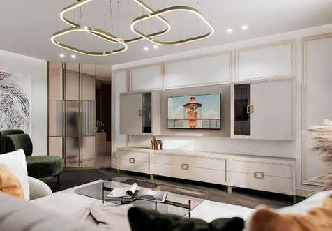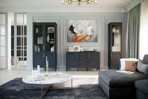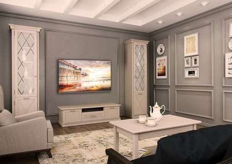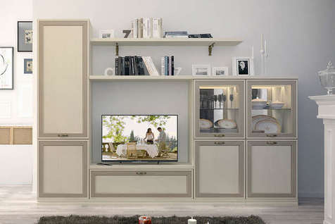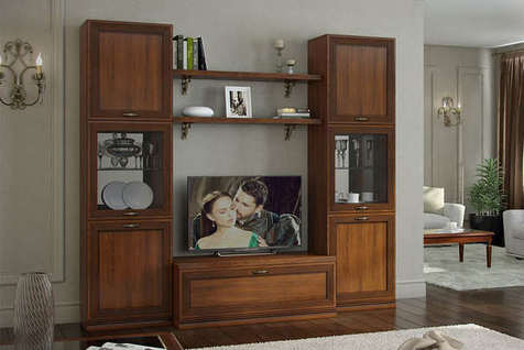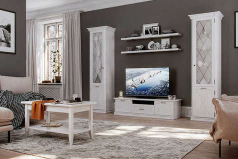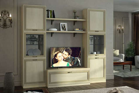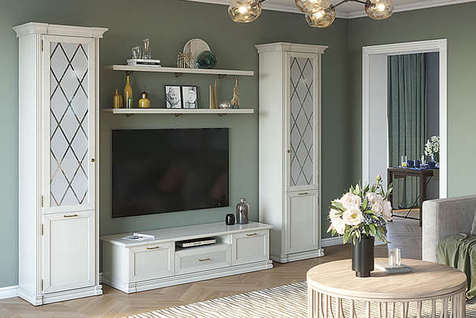 В комплект №80 гостиной «Орнета» входят два больших шкафа, широкая тумба для установки ТВ и широкая полка.