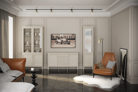 Шкаф арт. 1875 (2 шт) представляет собой каркас с четырьмя отделениями, разделёнными вертикальной перегородкой и стяжной полкой. В одной половине установлены четыре вкладные полки из ЛДСтП, отделения закрываются двумя глухими дверьми. В другой половине установлены четыре полки из стекла со светодиодными светильниками, отделения закрываются двумя стеклянными дверьми. Нагрузка на одну полку из стекла - не более 5 кг. Все двери навешиваются с помощью петель с доводчиками. Шкаф собирается с помощью эксцентриковых стяжек с геометрическим замыканием и нагелей.