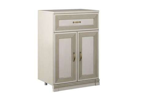 Под крышкой тумбы — открытая ниша, разделенная перегородкой, ниже — выдвижной ящик на направляющих скрытого монтажа со встроенным доводчиком;