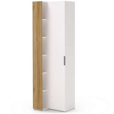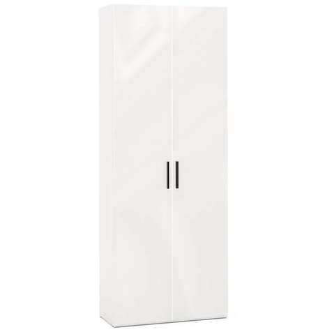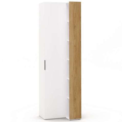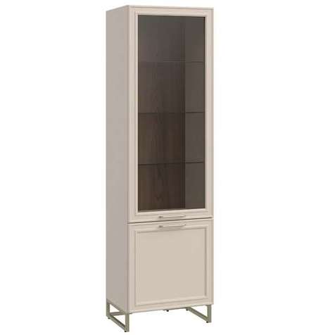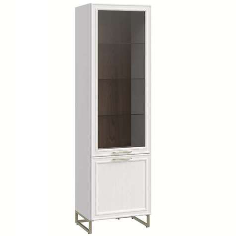 Представляет собой каркас из ЛДСтП с пятью стяжными полками толщиной 22 мм и двумя дверями со стеклянными вставками. Полки могут устанавливаться в одно из трёх положений по высоте. Двери вешаются на петли с самодоводом. Ручки расположены по центру дверей. Декоративные элементы крышки и дна – карниз и цоколь. Шкаф устанавливается на регулируемые опоры с регулировкой по высоте через отверстия дна, закрываемые заглушками.