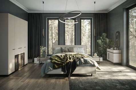 Спальня в современном стиле. Такая мебель универсальна и подойдет интерьерам в стилях эко, скандинавский, минимализм и лофт (в его более «легком» варианте);